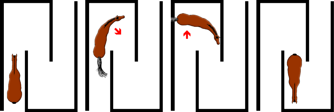 Imaginemos el caballo como una combinación entre un coche y una carretilla elevadora. En el coche, las ruedas que giran son las delanteras. En la carretilla elevadora, las ruedas que giran son las traseras. Las ruedas delanteras del coche se corresponderían con los anteriores o cuartos delanteros del caballo y las ruedas traseras de la carretilla elevadora se corresponderían con los posteriores o cuartos traseros del caballo. Cuando las ruedas delanteras del coche giran, el coche pivota sobre sus ruedas traseras que están fijas. Cuando las ruedas traseras de la carretilla elevadora giran, la carretilla elevadora pivota sobre sus ruedas delanteras que están fijas. La combinación de ambos movimientos daría como resultado distintos tipos de trayectoria en los giros, de más abiertos a más cerrados.