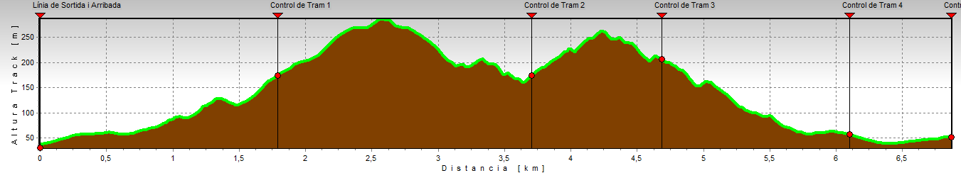 A part de la Línia de Sortida i de la Línia d’Arribada, hi ha marcat el Control de Fi d’Itinerari i quatre Controls de Trams. No hi ha marcat cap Control de Pas.