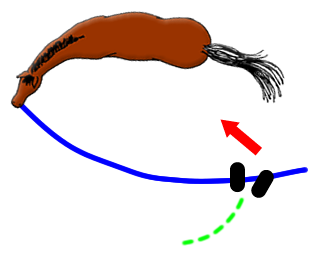 - Cuando el caballo no quiere avanzar o cambia repentinamente de sentido. En este caso pueden influir básicamente dos circunstancias: la habituación del caballo a tener al entrenador en su lado interior o la rigidez que puede presentar el caballo descrita anteriormente. En cualquiera de estas dos situaciones deberemos mantener tensión en la cuerda, no tirando hacia nosotros, sino evitando que el caballo cambie de sentido, a la vez que deberemos mantener la presión para obligar al caballo a que avance.