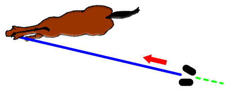 - Cuando el caballo nota tensión en la cuerda desplaza la grupa hacia el exterior y quizás avanza de lado. En este caso el entrenador ha de reconsiderar su posición, debe situarse por detrás del caballo y reducir tensión en la cuerda. Normalmente esta situación se produce cuando nos encontramos con caballos que presentan cierta rigidez en el lado interior y casi siempre se produce trabajando a mano derecha.