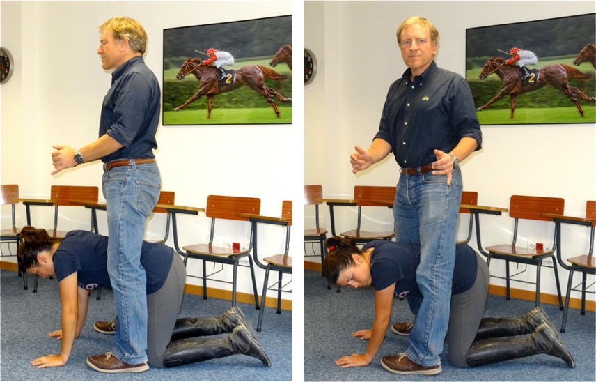Para realizar este ejercicio debemos pedirle a un alumno que se ponga a gatas, haciendo de caballo, y a otro que se ponga de pie, encima de él, con una pierna en contacto con cada uno de los costados del compañero y sin apoyar su peso sobre él. Hay que ser muy respetuoso con este ejercicio para que nadie se sienta ofendido.
