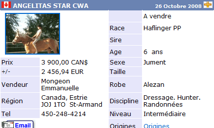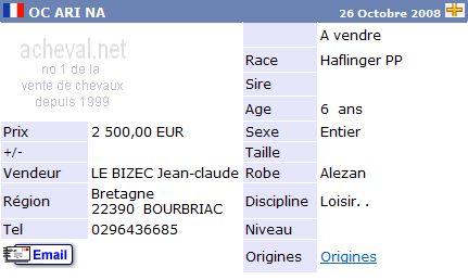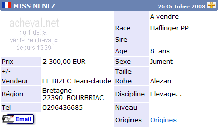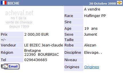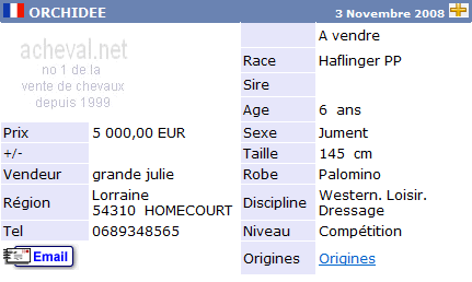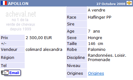 Una de las páginas Web más activas, y fuente de información de los precios es Acheval.net (http://www.acheval.net). La siguiente tabla muestra las fichas de seis caballos de la raza Halflinger buscados al azar. El precio correcto de compra estaría situado en torno a los 2.500€ de media por ejemplar.