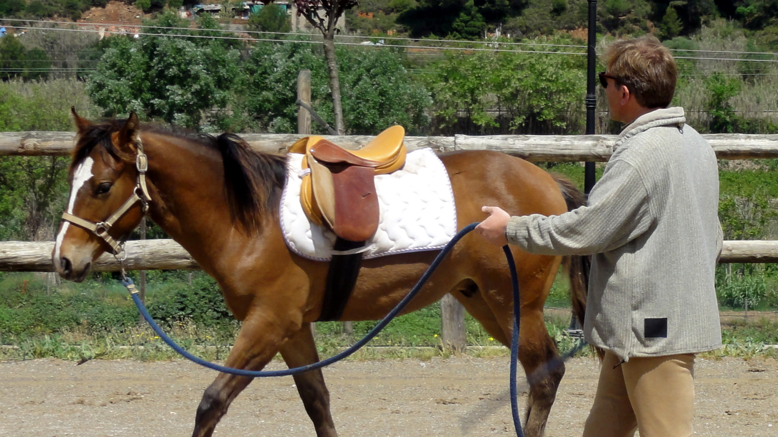 Hay algunos ejercicios con caballos que requieren la máxima movilidad de nuestros brazos. Por ejemplo, cuando pie a tierra y trabajando a la cuerda queremos enviar el caballo en una u otra dirección, o cuando llevamos el caballo del ronzal y necesitamos en un momento dado estirar de la cuerda para que avance, o ejercer presión con la cuerda para que pare. También en otras circunstancias, domando un potro o cuando la situación lo requiere, necesitamos tener la máxima amplitud de giro de nuestro tronco y brazos.