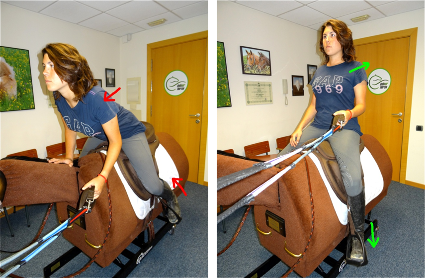 Pongamos en práctica otro ejercicio. Súbanse a su caballo (debidamente equipado) o encima de un taburete y denle la mano a un amigo que esté situado de pie a su lado. Pídanle que estire de su brazo y no hagan ningún tipo de fuerza ni con sus espaldas ni con sus talones. Verán como caen hacia adelante. Repitan el ejercicio retrasando sus escápulas y bajando los talones. ¡Ahora ya no hay quien les tire del caballo!