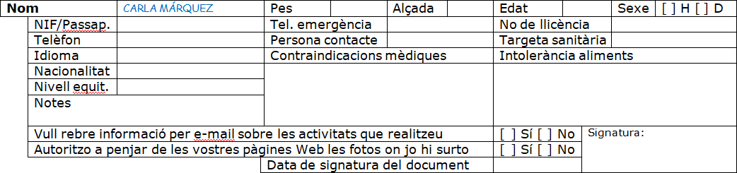 Suposem que ja ho sabeu, però volem recordar-vos que les activitats que es realitzant amb cavalls comporten sempre un cert risc, ja que son animals i poden tenir reaccions imprevistes, com espantar-se, ensopegar, mossegar o donar guitzes. També heu de saber, que si no es respecten les indicacions, l’activitat es pot suspendre en perjudici vostre i de tot el grup. Per tot això, us demanem autorització i marcar les caselles que corresponguin.